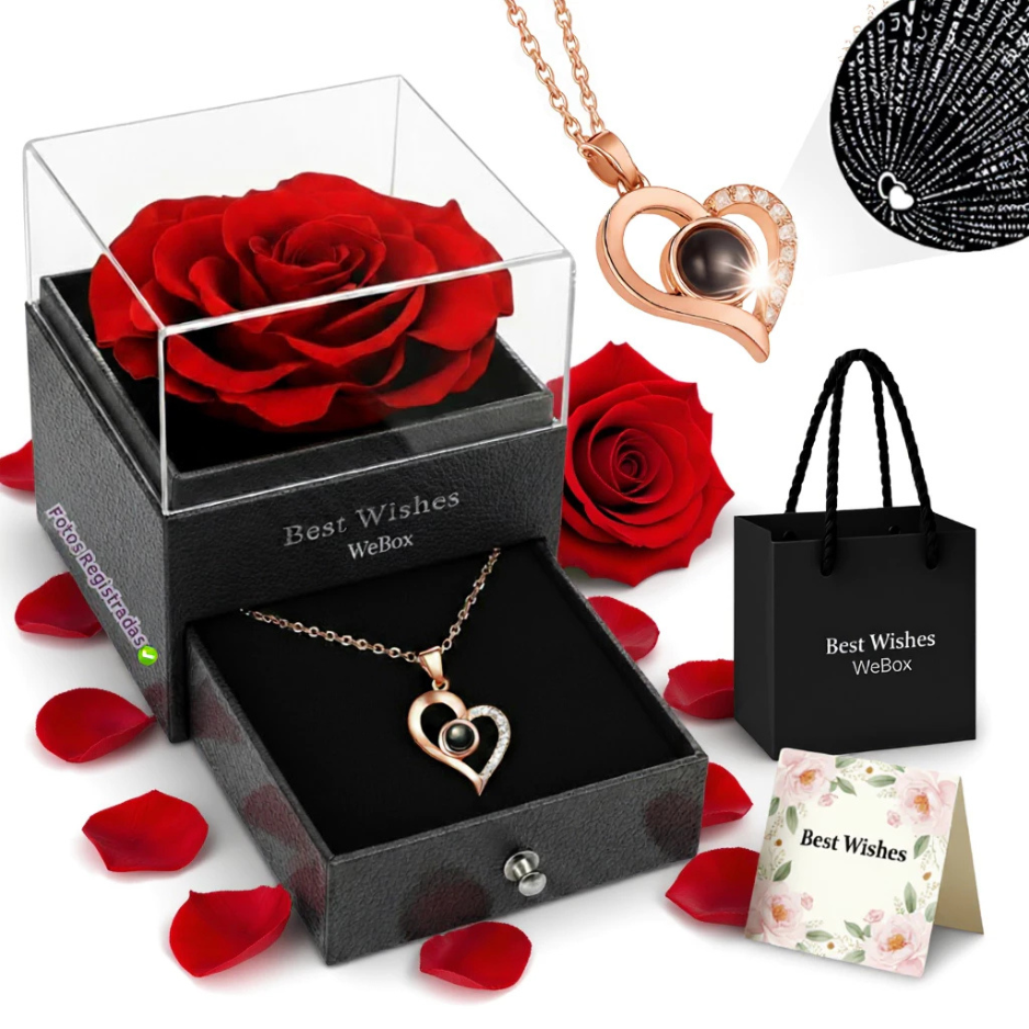Esta caixa sofisticada traz uma rosa vermelha preservada que dura anos e um delicado colar em aço inoxidável — com a mensagem “I LOVE YOU” traduzida em 100 idiomas escondida no interior da caixa. 💖🌍